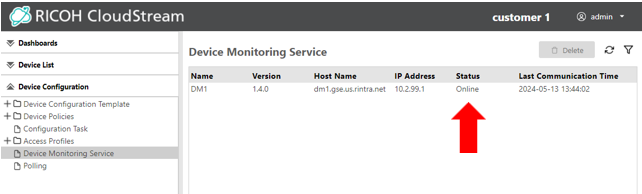 You may need to scroll right to view the Device Monitoring Service column. For devices added by a DMS, this column will show the Friendly name of the DMS that was created when it was installed on the On-premise server.