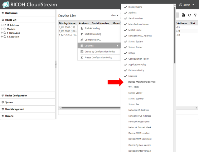 Select Columns and then select Device Monitoring to check the new column.