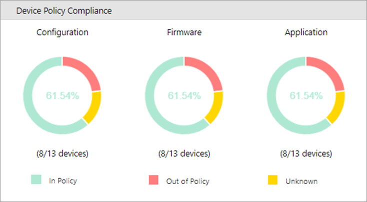 The Device Policy Compliance dashboard shows whether the devices are compliant with the security standards. The security standards are set when creating a configuration, embedded, and/or firmware policy.