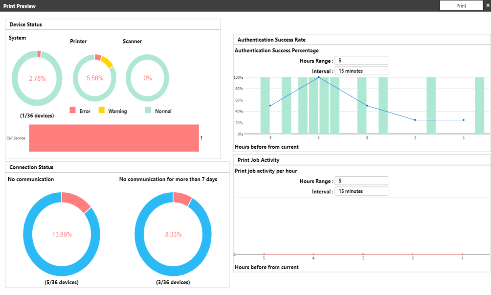 Clicking the Print icon will display a print preview of the dashboard; click the [Print] button to initiate printing.