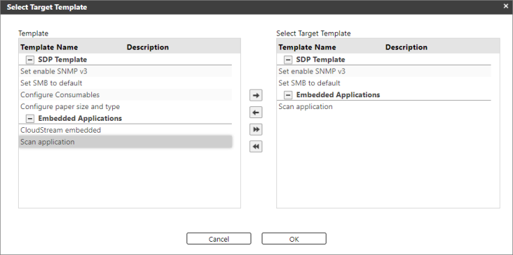 A "Select Target Template" pop-up dialog will display. On the left-hand side, the Templates pane lists all the available configuration templates. Select one or more templates, then click the right arrow button