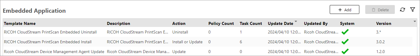 The default embedded templates are marked as checked under the System column, indicating that they are embedded templates that use the global version of the embedded application, and you cannot delete them. You can view the application version in the Version column.