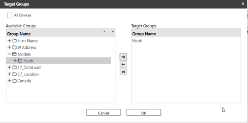 The list of Available Groups is based on the Device List groups configuration, whose defaults are Host Name, IP Address, and Models group. Customized groups are also displayed and can be selected as a target group.
