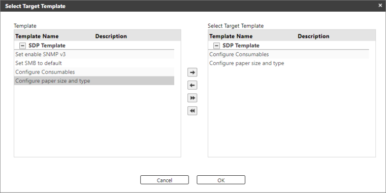 From the left-hand side, the Template pane lists all the available configuration templates. Select one or more templates, then click the right arrow button
