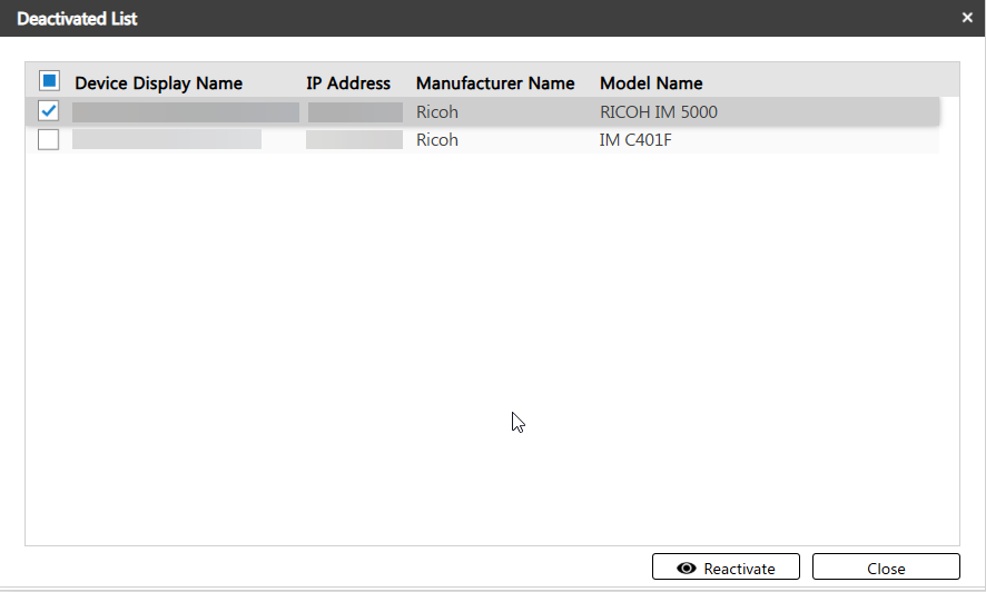 To reactivate a device, enable the checklist for that device, and then click Reactivate.