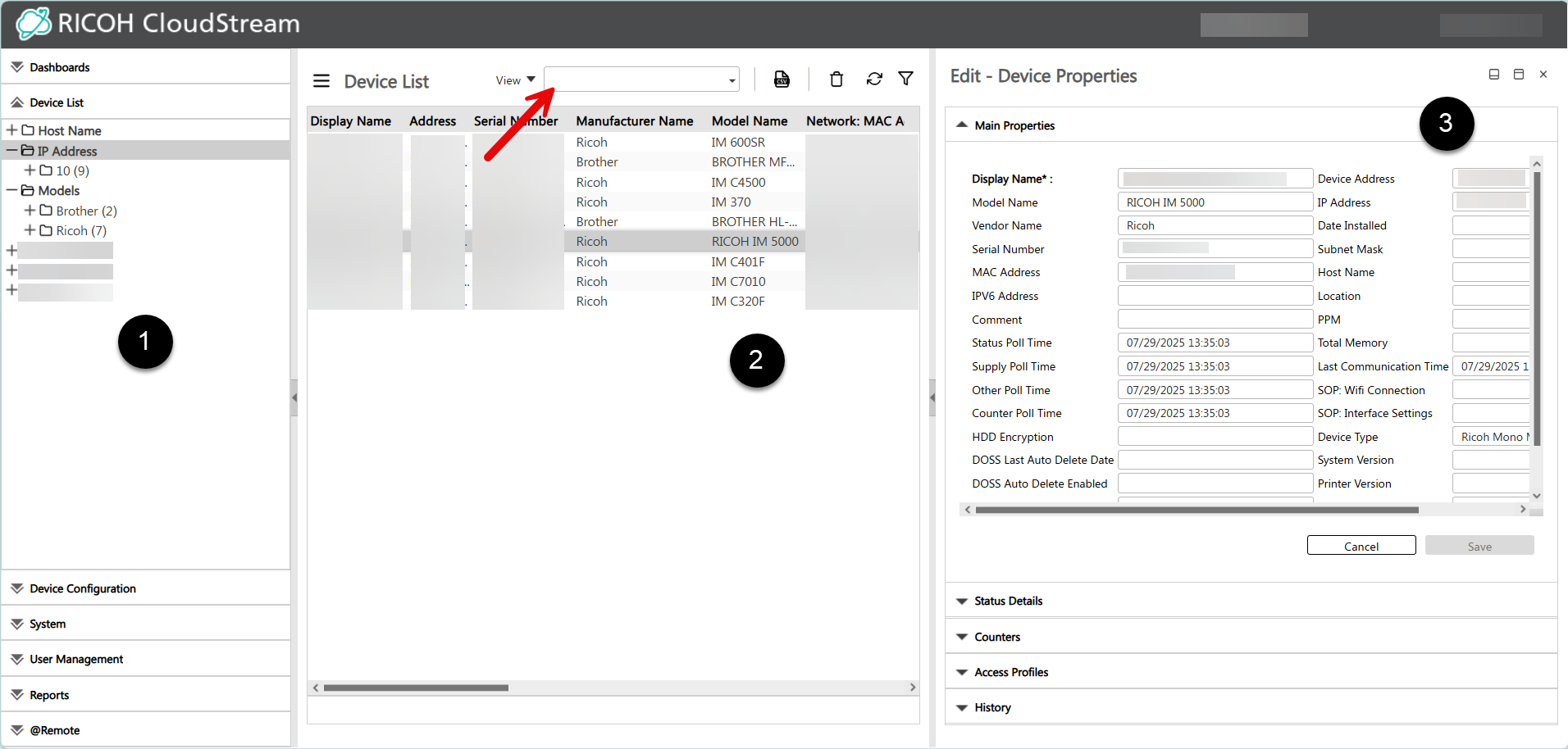 In this section, you can create categories and groups to manage your fleet efficiently. Selecting a device in the Device List grid will display the device properties.