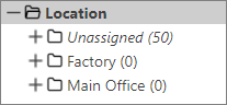 An example below shows the groups "Factory" and "Main Office" are created under the category "Location". Both newly created groups have zero devices in them; drag devices to the group to add them.