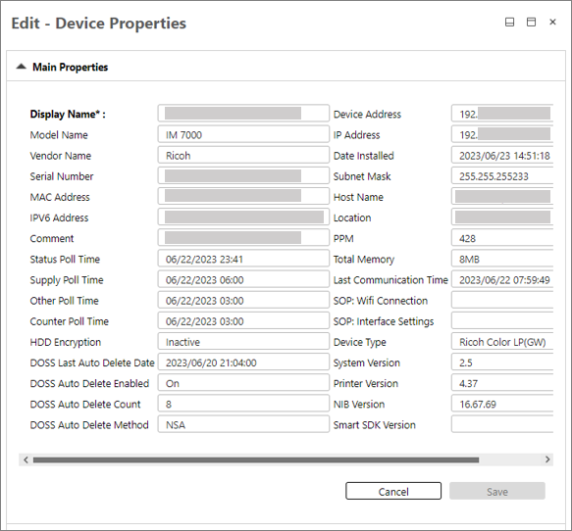 The information is obtained via polling. If there are changes in a device's information, the data will be updated in the next polling cycle. For non-Ricoh devices, only Main Properties, Status Details, Counters, Access Profiles and History are displayed.