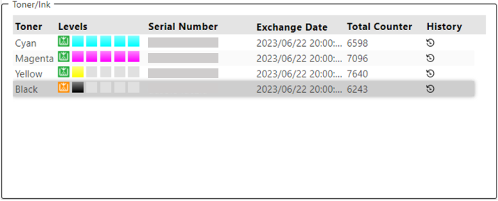 As you can see in the above example, each color has a History icon . When you click this icon, the toner history dialog will display.
