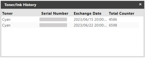 The dialog displays the history of toner cartridge replacement. You can find the date and time the cartridges were replaced, including the serial number and the total number of pages printed before the cartridge was replaced.