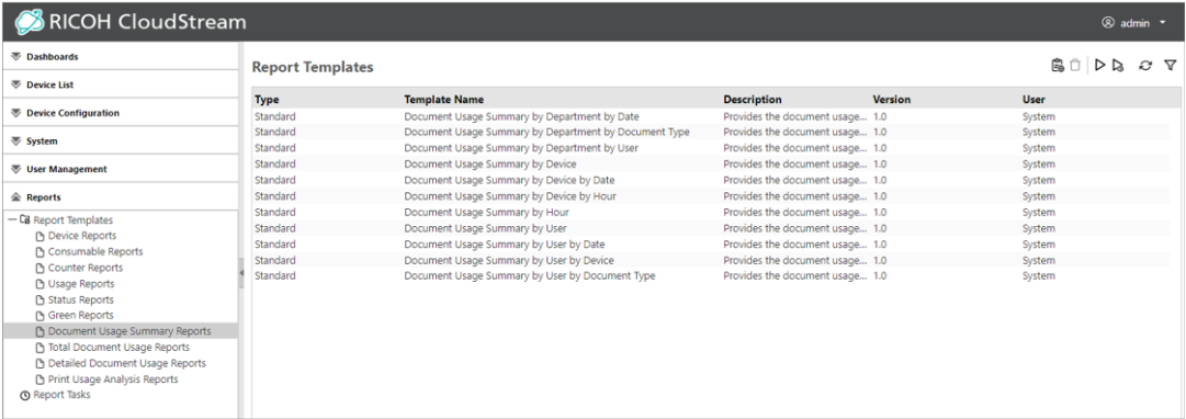 To create reports in this category, the RICOH CloudStream Print&Scan license is required in addition to the Device Management license.