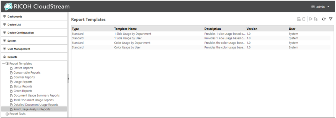To create reports in this category, the RICOH CloudStream Print&Scan license is required in addition to the Device Management license.