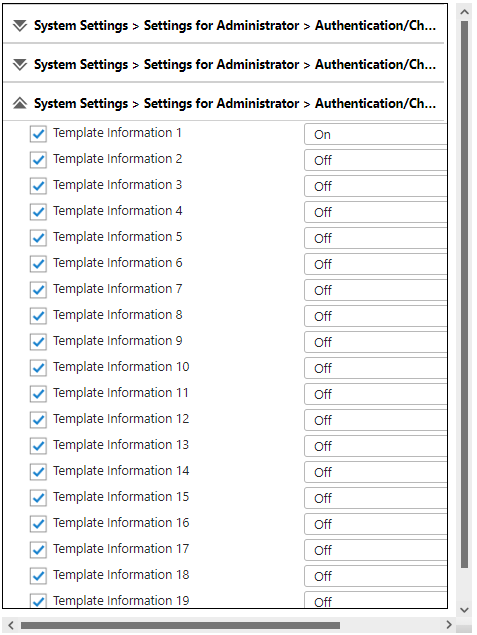 Expand System Settings ® Settings for Administrator ®Authentication/Change ®Administrator Authentication/User Authentication/App Auth ®Register/Change Administrator ®Template Management ®Template Information 1.