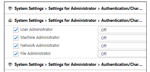Expand System Settings ® Settings for Administrator ®Authentication/Change ®Administrator Authentication/User Authentication/App Auth ®Register/Change Administrator.