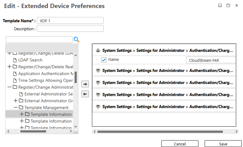This procedure allows you to create an Extended Device Preferences template that determines the device privileges that are associated with the specific FAR device group created within your OIDC or LDAP directory service.