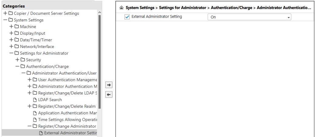 Expand System Settings®Settings for Administrator®Authentication/Change®Administrator Authentication/User Authentication/App Auth®Register/Change Administrator®External Administrator Group Management.