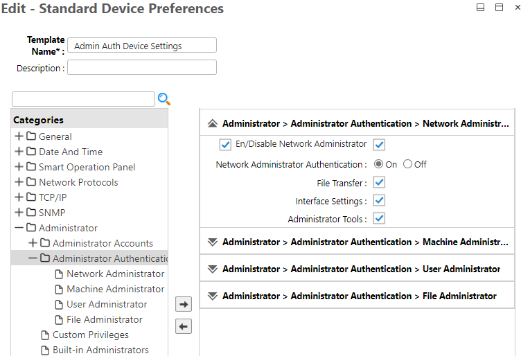 You must create a Standard Device Preferences (SDP) template that enables all Administrator Authentication preferences on the target device(s), including network, machine, user, and file administrator settings. After creating the template, you can create and run a configuration task to update these preferences on the target device(s).
