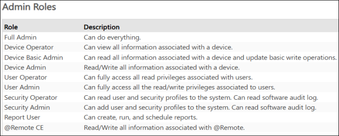 Local Administrators - The default 'admin' account is an example of a local administrator. As mentioned, you can create other local administrators and assign them to a role.