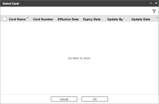 Click [Add]. A dialog will display, showing all the registered cards. If you still need to register the cards, register them in Register Cards.