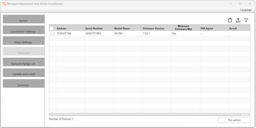The Firmware Version column, Firmware Status column, and DM Agent columns are also updated accordingly after clicking [Run Action]. |