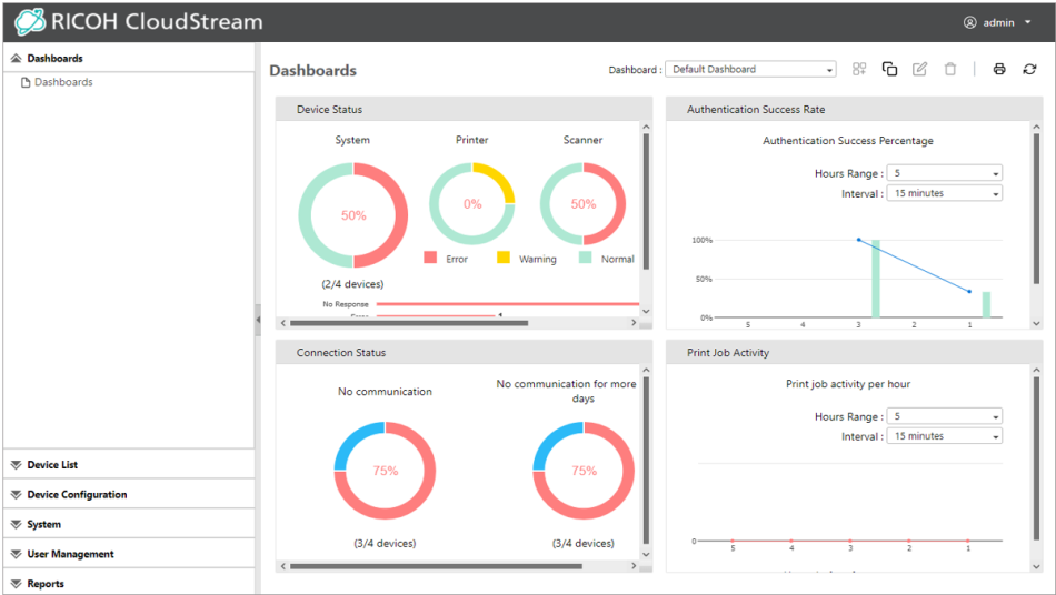 The RICOH CloudStream Device Management (DM) portal allows you to manage multiple devices, configure system settings, and manage users and administrators, all of that in one simple application.